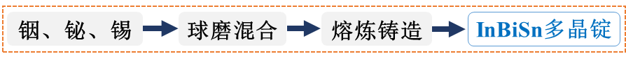 熔煉鑄造法適用于制備高純高致密的靶材,且工藝簡單,可簡述成三步:原料熔煉、澆注成錠、鑄錠加工。熔煉鑄造法的主要產(chǎn)品是高純合金錠,以銦鉍錫(In-Bi-Sn)多晶錠為例,具體工藝參數(shù)如下: